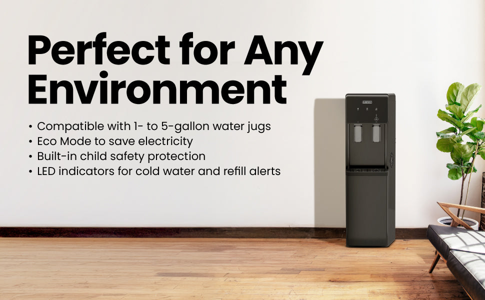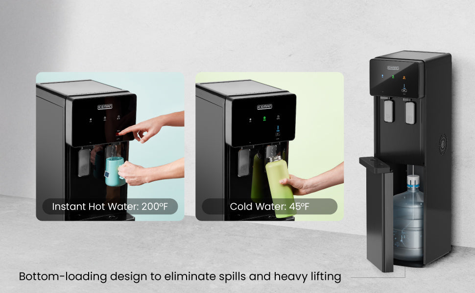 Choose between crisp cool water chilled to 45°F or hot water heated to 200°F for coffee, tea, or instant meals. The bottom-loading design makes refilling effortless, fitting bottles from 1 to 5 gallons without any heavy lifting.