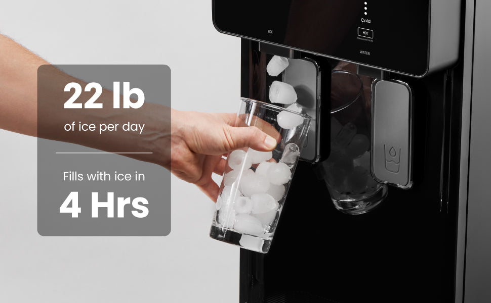 Meet your all-in-one hydration station. This bottom-loading water and ice dispenser combines an ice maker, hot water dispenser, and cold water cooler in one sleek design. With just a 5-gallon water bottle, it produces up to 22 pounds of bullet-style ice each day, perfect for keeping drinks cold and guests refreshed.