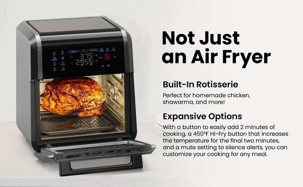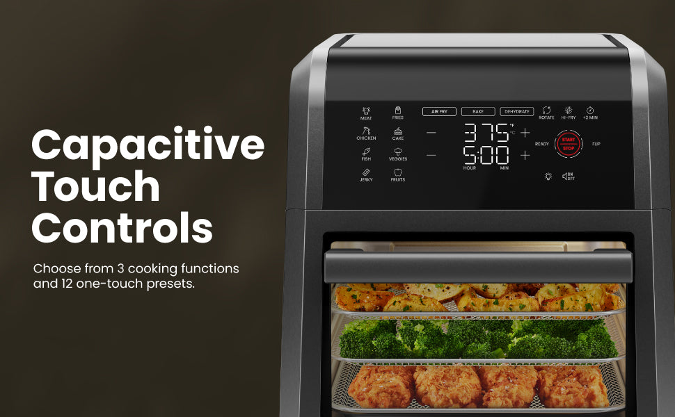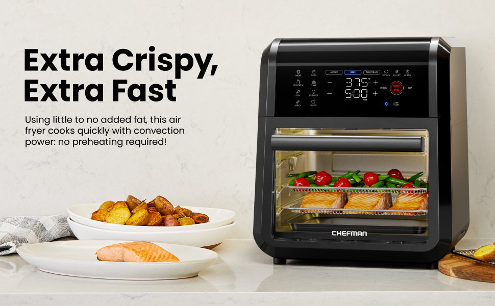 Descubra la máxima comodidad con la Freidora de Aire Digital Multifuncional Chefman+. Con funciones de asador, horno tostador y deshidratador, esta maravilla de encimera completa cualquier tarea de cocina, horneado o fritura de aire. La tecnología de aire rápido y el sistema de horno de convección de alta velocidad logran una textura frita uniforme y crujiente con poco o nada de aceite. Su capacidad de 12 cuartos le garantiza cocinar para muchas personas, y sus 12 opciones de cocción predefinidas facilitan la preparación de la cena. Fría alitas crujientes, ase pollos enteros, deshidrate frutas frescas, hornee deliciosos pasteles, recaliente las sobras de pizza ¡y mucho más!