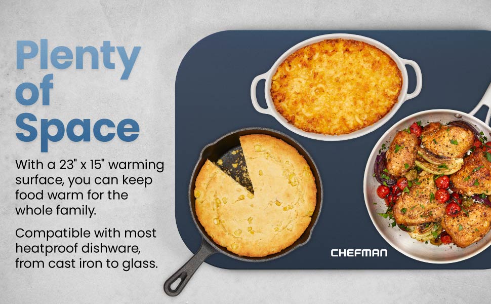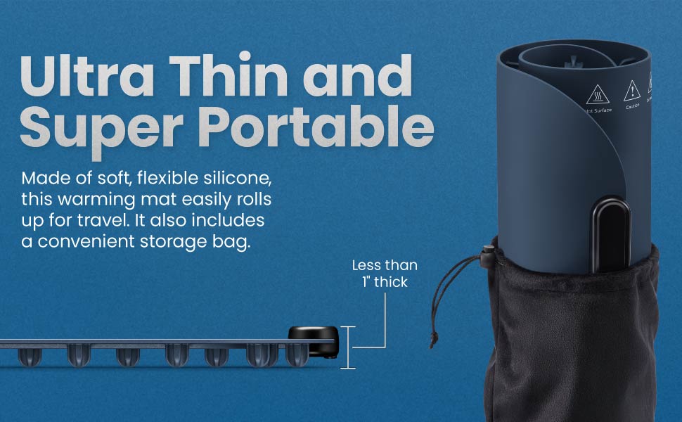 Keep your meals warm and ready to serve with our rollable warming mat. Featuring a spacious 23" x 15" surface, it easily fits main dishes and sides, making it perfect for family dinners, potlucks, or parties. Its sleek, foldable design rolls up into a compact 4-inch cylinder for effortless storage or travel, with a storage bag included.
