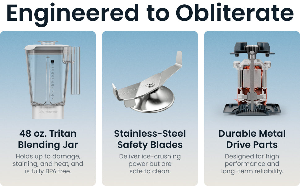 Licúa fácilmente ingredientes difíciles con la licuadora Obliterator Power de 1,2 litros. Su potente motor de 1380 W y su avanzado sistema de flujo de aire facilitan la trituración de hielo, manteniendo la licuadora fresca y silenciosa. La función Auto Blend optimiza el licuado para obtener los mejores resultados, y los controles giratorios fáciles de usar ofrecen seis velocidades y tres funciones predefinidas. Incluye un vaso de viaje de 590 ml y un prensador/raspador para mayor comodidad.