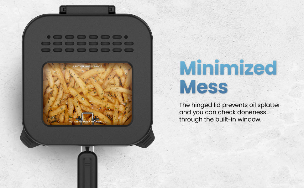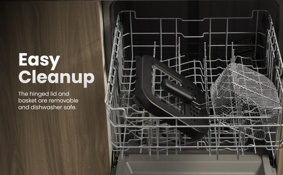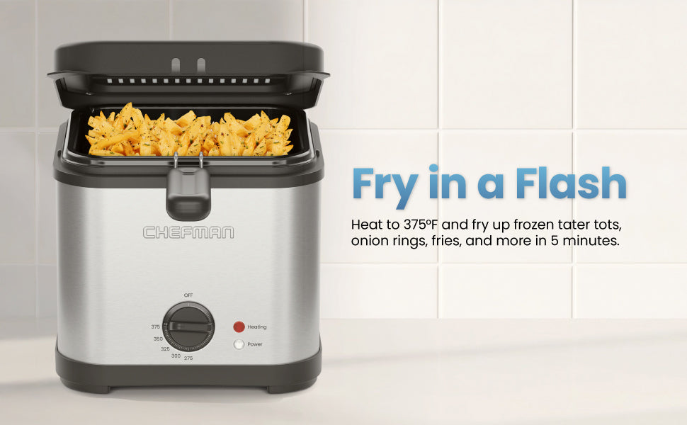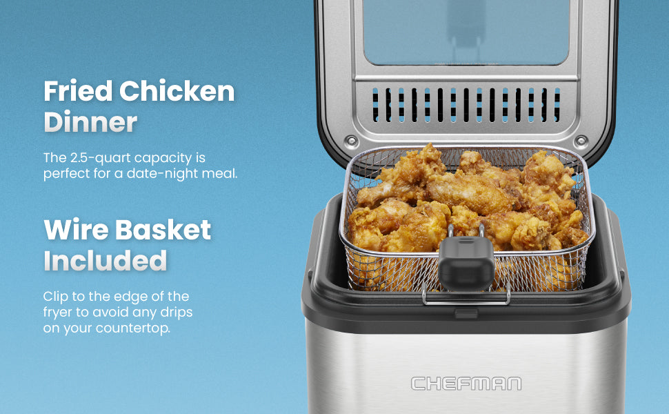 Fry family favorites to perfection at home with the Chefman Fry Guy Electric Deep Fryer. Its XL 2.5‑quart basket easily handles large portions, while adjustable temperature control and a viewing window ensure perfectly cooked results every time. The hinged safety lid with built-in oil filters keeps cooking safe and mess-free, and the dishwasher-safe basket makes cleanup a breeze. Frying for a crowd has never been easier!