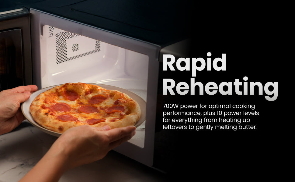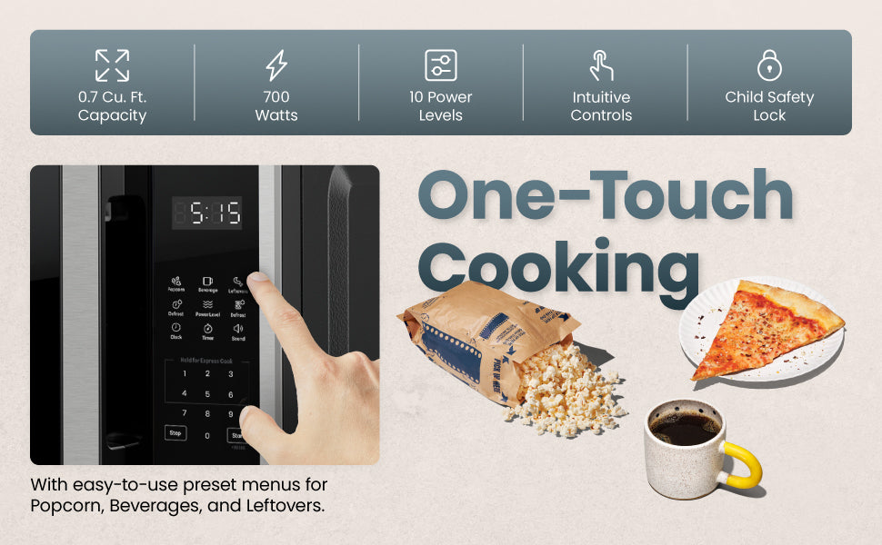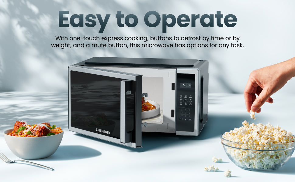 The Chefman Stainless Digital Countertop Microwave offers high-powered cooking with just the push of a button. With 3 food preset menus, a +30 seconds button, and a one-press express cook, microwaving is faster than ever and just as quick to set up. Choose to cook quieter with the mute option, defrost by time or by weight, or use the digital timer to track any other cooking tasks. The microwave oven lock stops the door from opening accidentally. The interior easily wipes clean, and the glass turntable is top-rack dishwasher safe. No more worrying about forgotten dinners; Chefman microwaves get food on the table quickly.