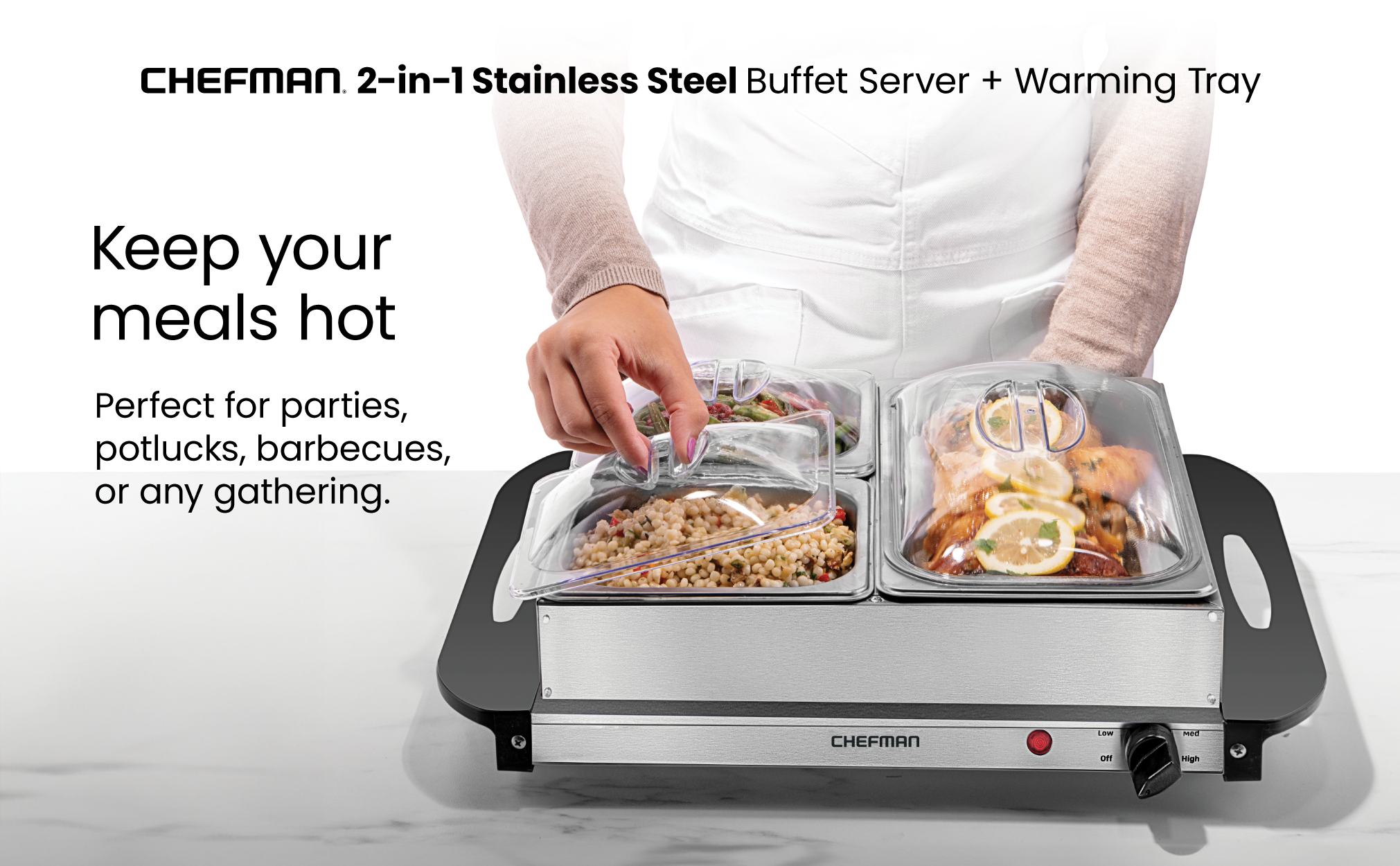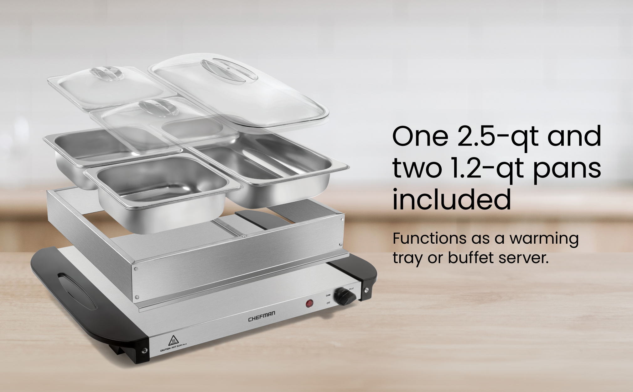 BUFFET SERVERS INCLUDED: Three stainless steel warming pans are included; two 1.2 Qt warming pans and one 2.5 Qt warming pan. The 3 high dome transparent lids keep the heat in. Accessories are dishwasher safe for easy clean up.