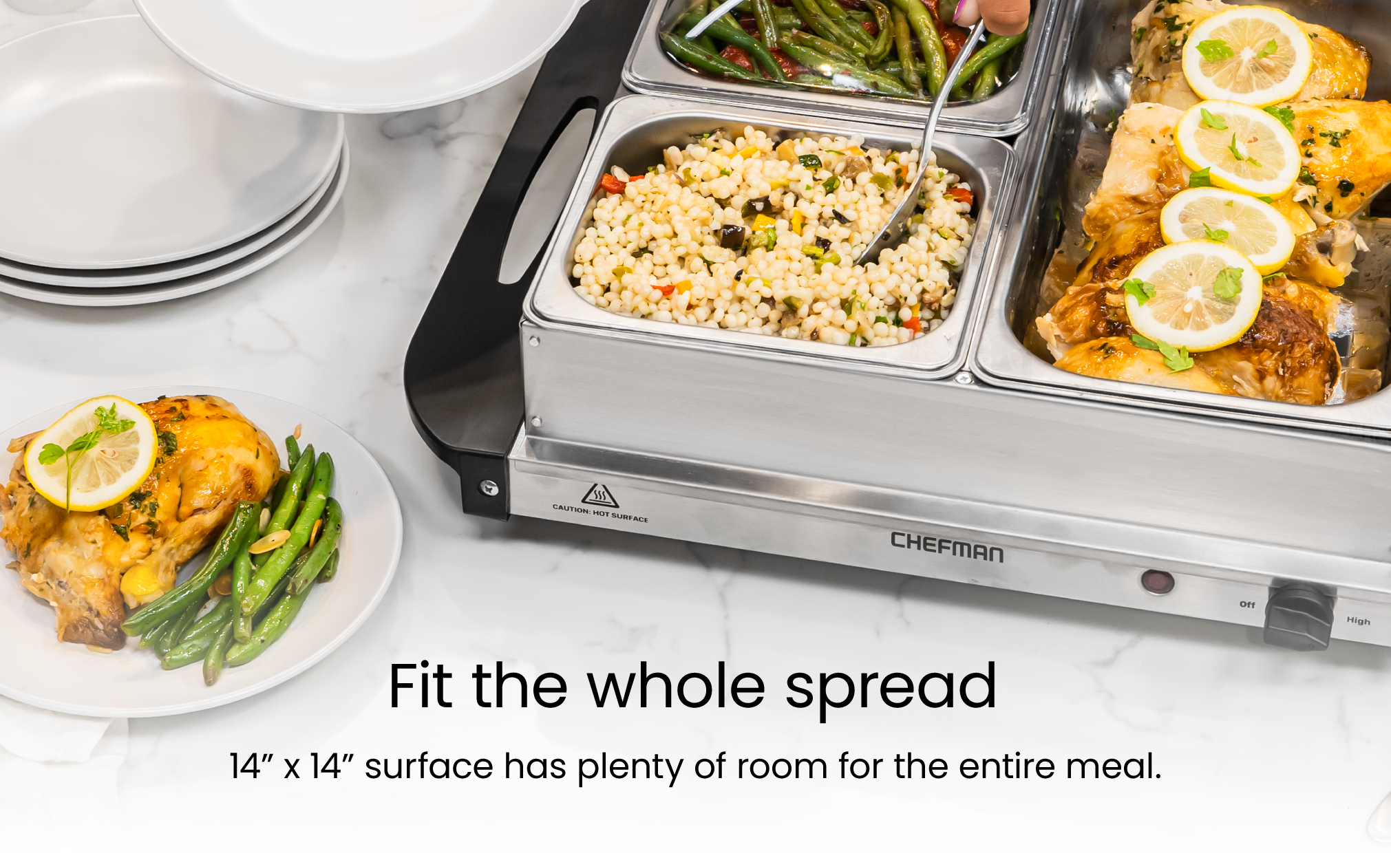 PERFECT FOR ANY OCCASION: The 5-quart capacity pans and 14" x 14" hot plate surface can fit several dishes at once and looks great on any countertop, table, or buffet. The adjustable temperature control and size makes it suitable for family dinners, Sunday football gatherings, holiday meals, or other big parties and events.