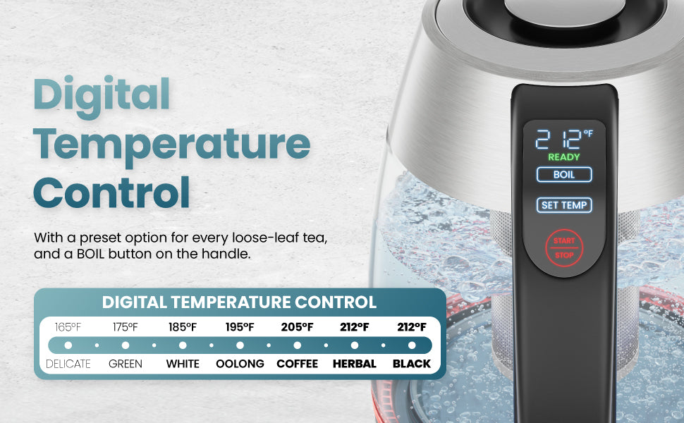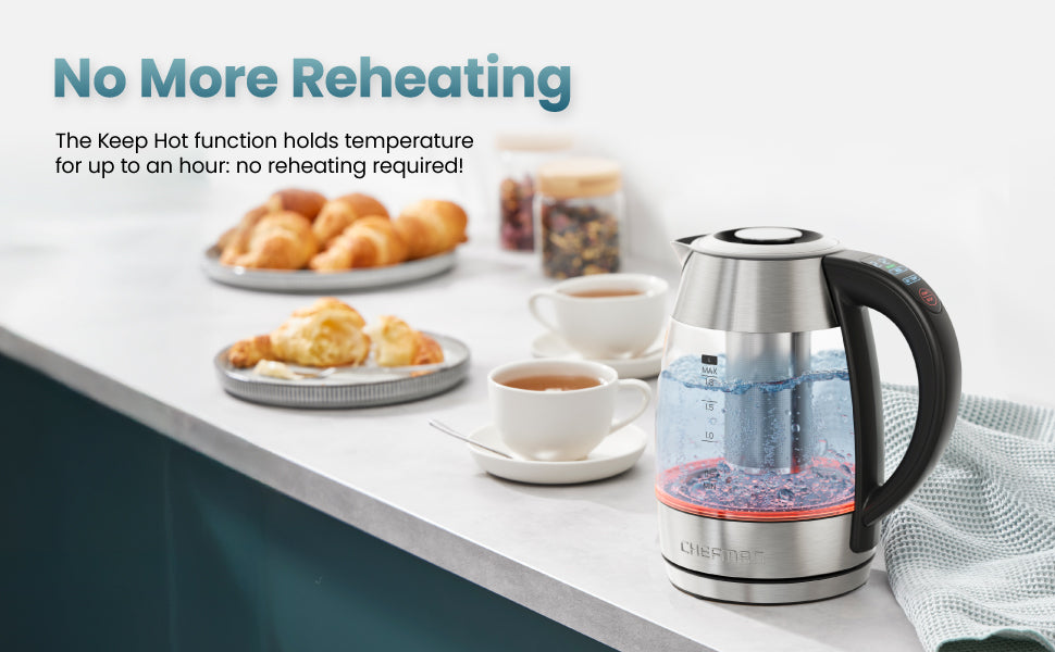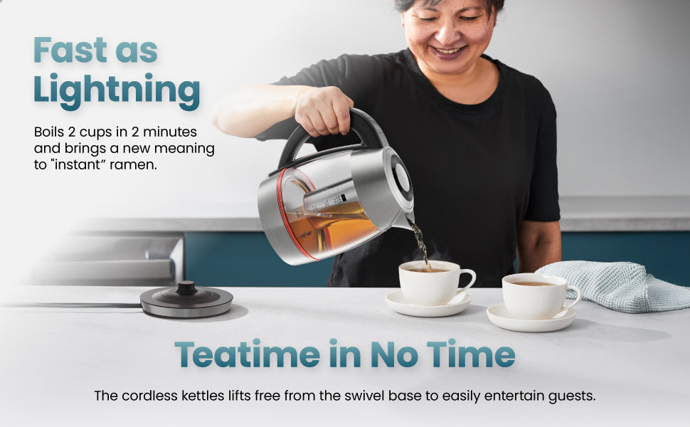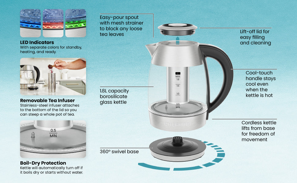 Boil water in as little as 2 minutes with the Chefman Lightning Kettle. Its digital temperature control and Keep Hot function let you enjoy tea, coffee, or hot chocolate at the perfect temperature. The removable infuser, 360° swivel base, and drip-free spout make serving and cleaning effortless, while built-in safety features provide peace of mind.