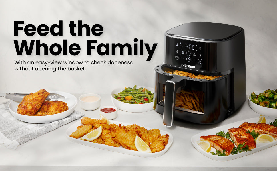 Meet your new kitchen essential: the compact yet powerful 6-quart digital air fryer. With a sleek design that saves space and a digital display that offers four one-touch presets, it’s perfect for fast, healthy meals for 3–5 people. Craving that extra crunch? Turn up the heat with 450°F Hi-Fry Technology to finish off fries, wings, and more. The easy-view window lets you monitor your food without opening the basket, while shake notifications ensure even cooking. Cleanup is a breeze thanks to the dishwasher-safe nonstick basket and rack.